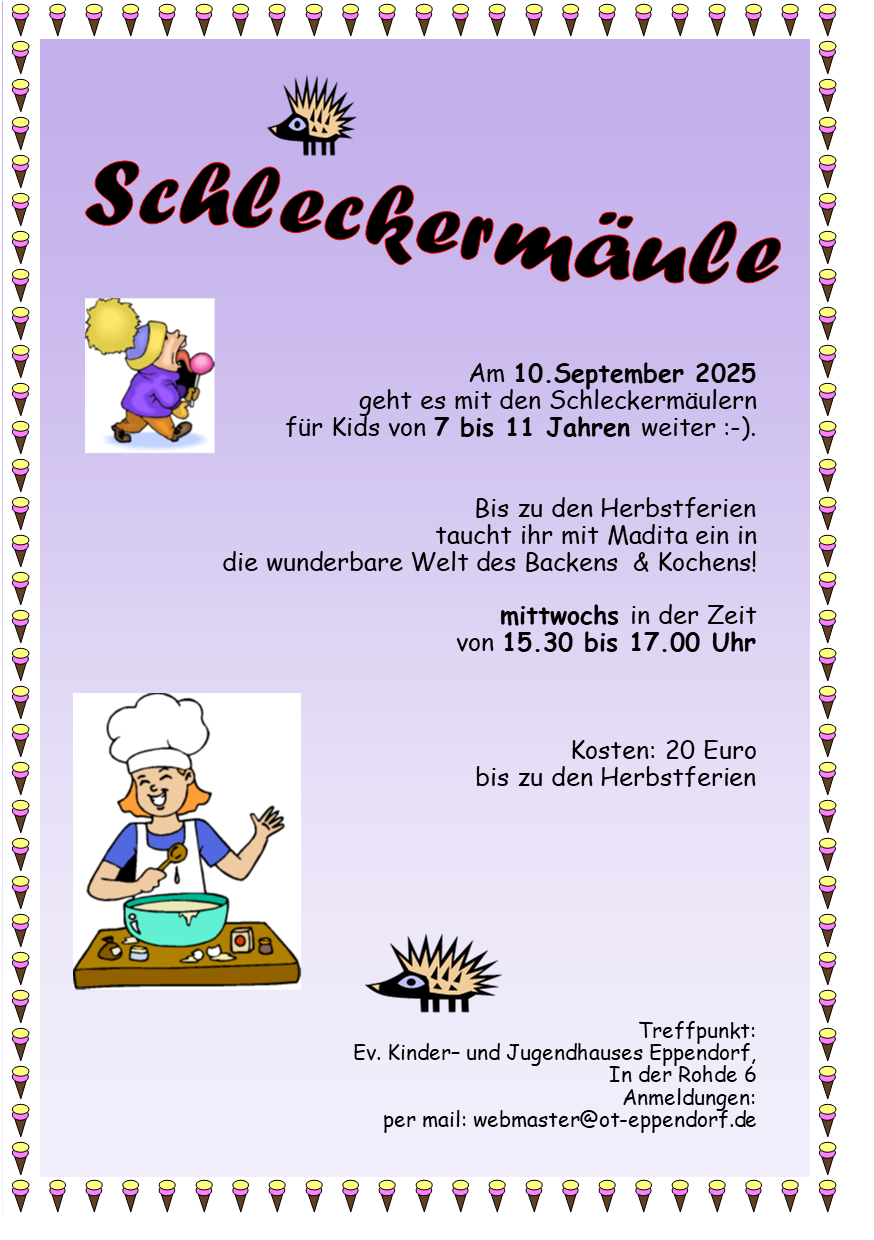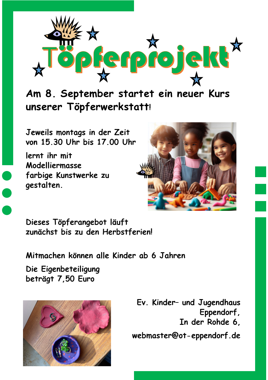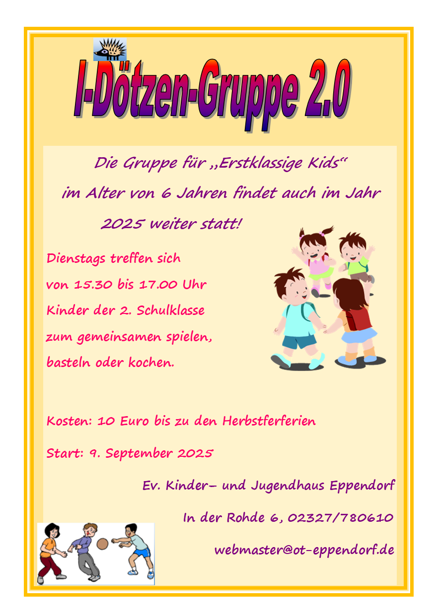 Hallo Kids!! Dies sind unsere Gruppenangebote ab Mai 2025. An den Samstagen gibt es jeweils in der Zeit von 15.00 bis 18.00 Uhr unterschiedliche Aktionen! Diese Gruppen starten ab dem 5. Mai 2025 ! Bitte beachtet die genauen Starttermine! Über eine Anmeldung per Mail würden wir uns freuen ! A webmaster@ot-eppendorf.de