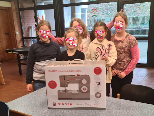 ![]() Diese neue Nähmaschine übergab der Förderverein Pro Kids Anfang Februar 2024 den Kindern des "Kreativen Nähprojektes" . Jetzt hat jedes Kind eine "eigene" Nähmaschine :-). |